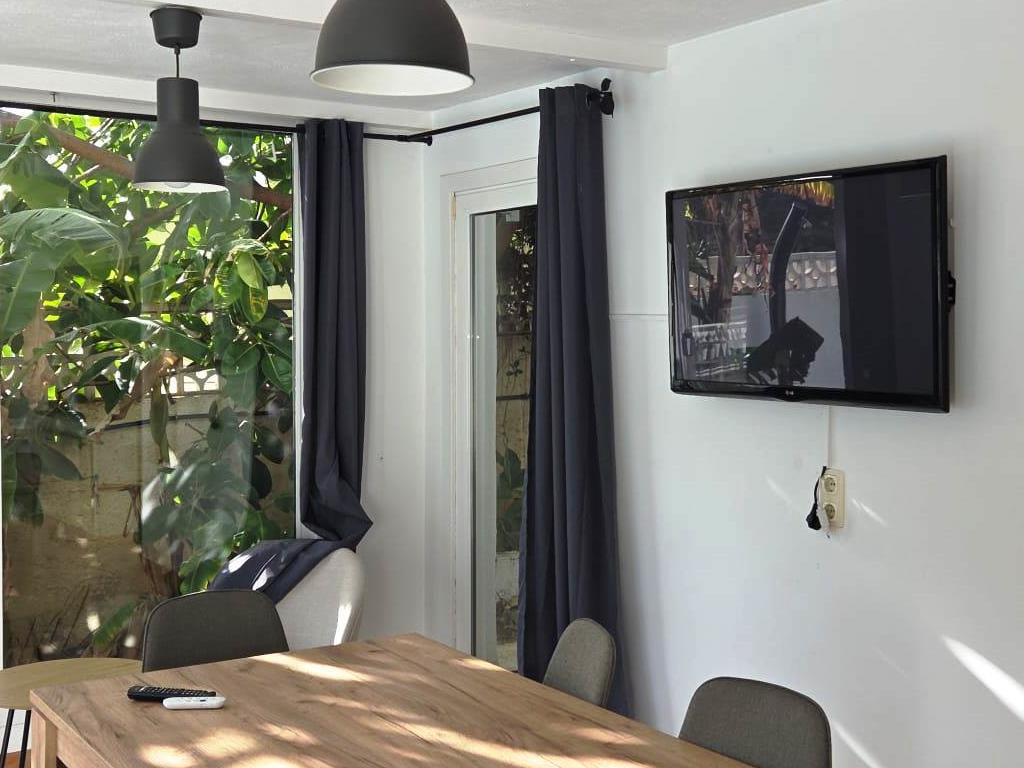La planta baja consta de un salón con TV con chromecast y wifi, una cocina con nevera combi, horno, placas de gas, lavavajillas y micro-ondas, un comedor, y un dormitorio doble con aire acondicionado y ventilador de techo y un cuarto de baño con bañera y wc.